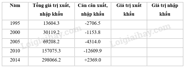 Giải câu 9 trang 100 sách bài tập Địa lí 12, Cho bảng số liệu sau: a) Tính giá trị xuất khẩu, giá trị nhập khẩu, điền vào bảng số liệu trên.