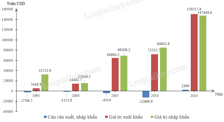 – Giai đoạn 1995 – 2010: giá trị nhập khẩu luôn lớn hơn giá trị xuất khẩu, vì vậy cán cân xuất, nhập khẩu luôn âm (nhập siêu). Nguyên nhân chủ yếu do nước ta đang trong quá trình công nghiệp hóa – hiện đại hóa nên nhập khẩu nhiều máy móc, trang thiết bị,… có giá trị cao,… Nhập siêu lớn nhất vào năm 2010 (-12609,9 triệu USD).