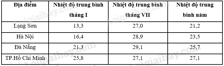 + Tháng I: Miền Bắc chịu tác động mạnh của gió mùa Đông Bắc (lạnh, khô) nên nhiệt độ thấp <180C: Lạng Sơn (13,30C), Hà Nội (16,40C). Khi di chuyển xuống phía nam, gió mùa Đông Bắc suy yếu dần, bớt lạnh hơn và hầu như bị chặn lại ở dãy Bạch Mã. Từ Đà Nẵng trở vào, Tín Phong bán cầu Bắc (khô, nóng) cũng thổi theo hướng đông bắc chiếm ưu thế nên các địa điểm phía Nam vẫn có nền nhiệt cao >200C: Đà Nẵng (21,30C), TP Hồ Chí Minh (25,80C).