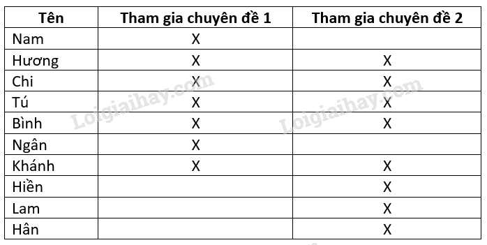 Lập bảng liệt kê các thành viên và chuyên đề. Đánh dấu x nếu thành viên đó có tham gia.