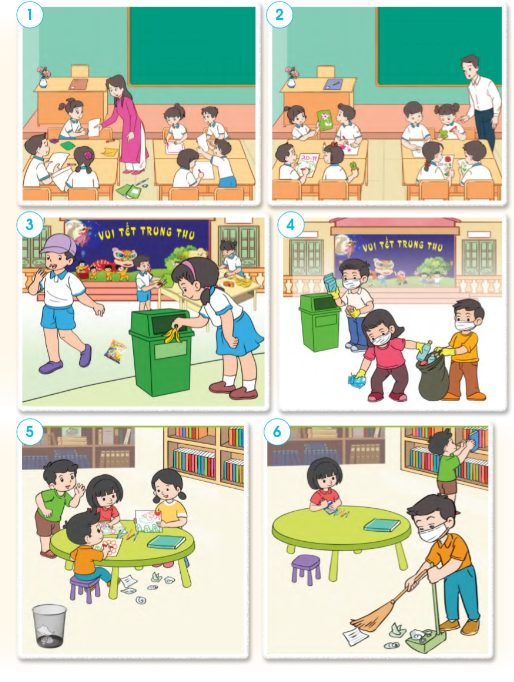 Hình 6: Các bạn nên thu dọn, quét sạch giấy rác và cất gọn sách sau khi học tập, vui chơi.