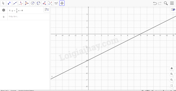 b) Nhập hàm số \(y = \frac{1}{2}x – 4\) trên ô lệnh, màn hình sẽ hiện thị đồ thị của hàm số