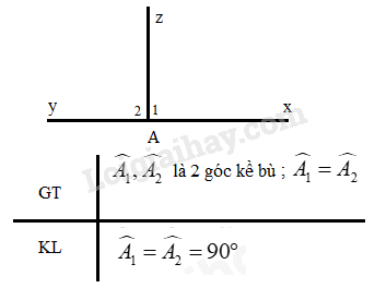 Vẽ hình và viết giả thiết, kết luận của định lí: “ Hai góc đối đỉnh thì bằng nhau”…Em hãy chứng minh định lí: “ Hai góc kề bù bằng nhau thì mỗi góc là một góc vuông”