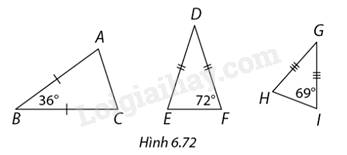 \(\widehat A = \widehat C = \frac{{180^\circ  – \widehat B}}{2} = \frac{{180^\circ  – 36^\circ }}{2} = 72^\circ \)