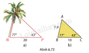 Trong Hình 6.73a, đỉnh \(\left( M \right)\), gốc \(\left( N \right)\) của cây dừa và vị trí bạn Phương đứng \(\left( P \right)\) tạo thành tam giác \(MNP\). Phương đo được \(\widehat N = 77^\circ ,\widehat P = 43^\circ \) và \(NP = 20m\). Phương vẽ tam giác \(ABC\) có \(\widehat B = 77^\circ ,\widehat C = 43^\circ \) và \(BC = 10cm\) (Hình 6.73b), đo độ dài cạnh \(AB\) và từ đó tính chiều cao \(MN\) của cây dừa. Em hãy giải thích cách làm của Phương và tính chiều cao \(MN\) của cây dừa nếu \(AB = 7,9cm\)