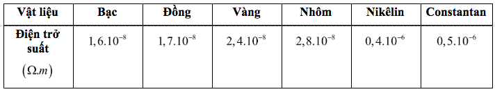 Bảng sau cho biết điện trở suất của một số vật liệu ở \({20^0}C\)