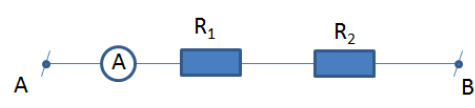 b. Cho điện trở \({R_1} = 80\Omega \) và điện trở \({R_2} = 60\Omega \) mắc nối tiếp nhau vào nguồn điện có hiệu điện thế \(U\). Một ampe kế được mắc vào mạch điện để đo cường độ dòng điện chạy qua \({R_1}\). Số chỉ Ampe kế là \(0,2A\). Vẽ sơ đồ mạch điện và tính hiệu điện thế \(U\) của nguồn điện.