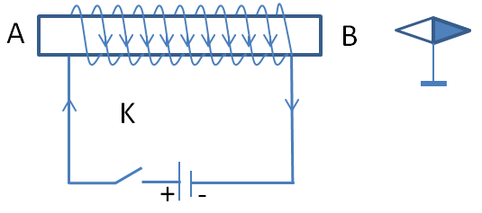 Cho mạch điện như hình vẽ: Khi đóng khóa K, một đầu kim nam châm bị hút vào ống dây AB.