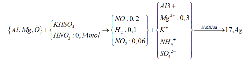 Câu 7: Hòa tan hết m gam hỗn hợp E gồm Al, Mg, MgO trong dung dịch hỗn hợp gồm HNO3 (0,34 mol) và KHSO4. Sau phản ứng thu được 8,064 lít (đktc) hỗn hợp khí X gồm NO, H2 và NO2 với tỉ lệ mol tương ứng 10 : 5 : 3 và dung dịch Y chỉ chứa muối. Cho NaOH dư vào Y thì có 2,28 mol NaOH tham gia phản ứng, đồng thời thu được 17,4 gam kết tủa xuất hiện. Phần trăm về khối lượng đơn chất Mg trong E là