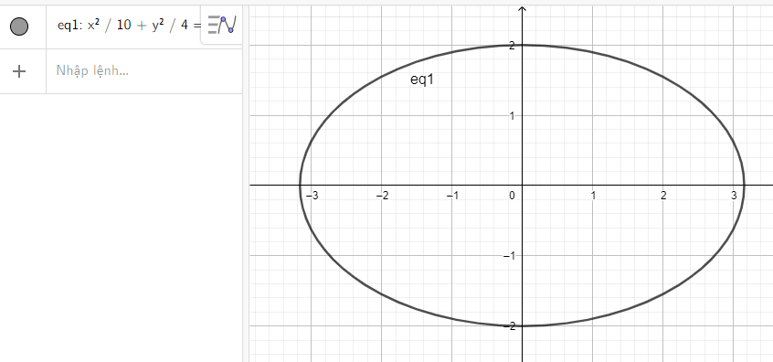 a) Nhập phương trình elip theo cú pháp x^2/10 + y^2/4 = 1  vào vùng nhập lệnh ta được hình elip dưới đây: