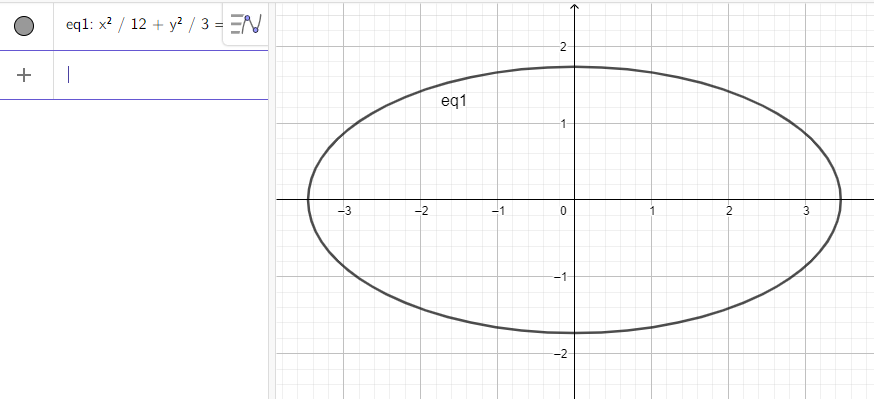 b) Nhập phương trình elip theo cú pháp x^2/12 + y^2/3 = 1  vào vùng nhập lệnh ta được hình elip dưới đây: