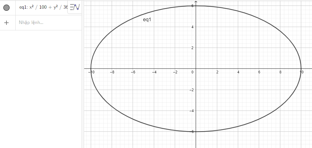 c) Nhập phương trình elip theo cú pháp x^2/100 + y^2/36 = 1  vào vùng nhập lệnh ta được hình elip dưới đây: