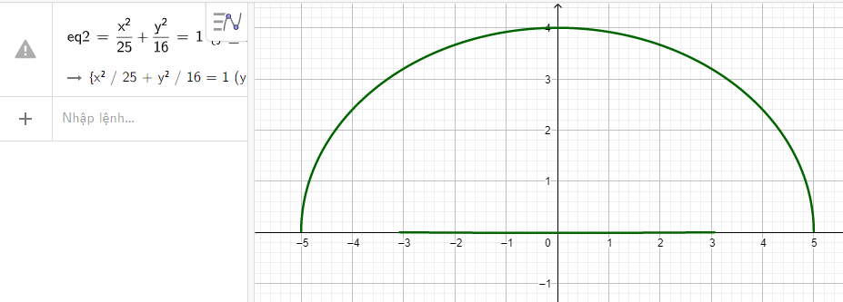 Nhập phương trình elip theo cú pháp x^2/25 + y^2/16 = 1 {y>=0} vào vùng nhập lệnh ta có hình vẽ mô phỏng đường hầm dưới đây