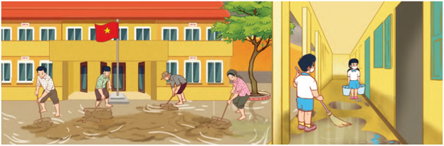 – Mọi người đang dọn dẹp bùn đất, nước,… ở trường học.