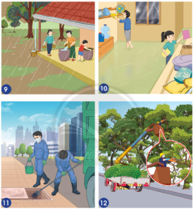 – Hình 12: Chặt bớt cành cây => Tránh rơi vào người, đổ cây khi bão đến.