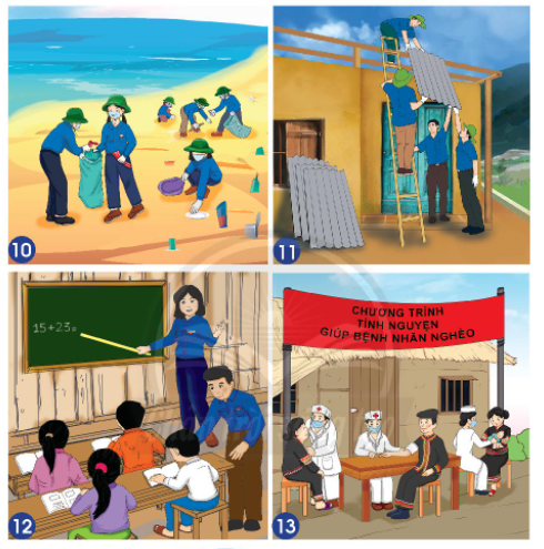 Em quan sát kĩ các bức hình và cho biết những người trong hình đang làm công việc gì? Em đoán xem những công việc ấy mang lại lợi ích gì cho những người xung quanh.