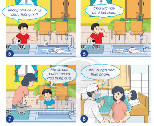 – Tranh 6: Nói rồi, Nam tiến đến và mở chai sữa ra uống. Nam nhận ra chai sữa có vị hơi chua nhưng bạn vẫn không dừng lại mà tiếp tục uống.