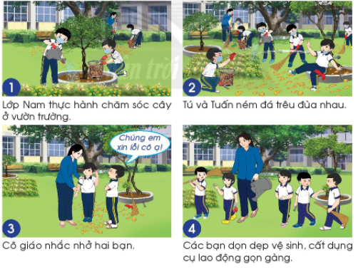 – Hình 3: Thấy hành động của 2 bạn, cô giáo đã nhắc nhở và nói cho 2 bạn biết rằng việc đùa nhau như vậy rất nguy hiểm. Sau khi nghe lời nhắc nhở của cô giáo, Tú và Tuấn xin lỗi cô.