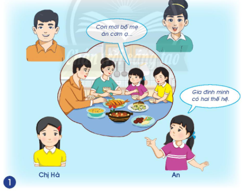 Em quan sát kĩ bức tranh và kể các thành viên xuất hiện trong tranh theo thứ tự từ người nhiều tuổi đến người ít tuổi.