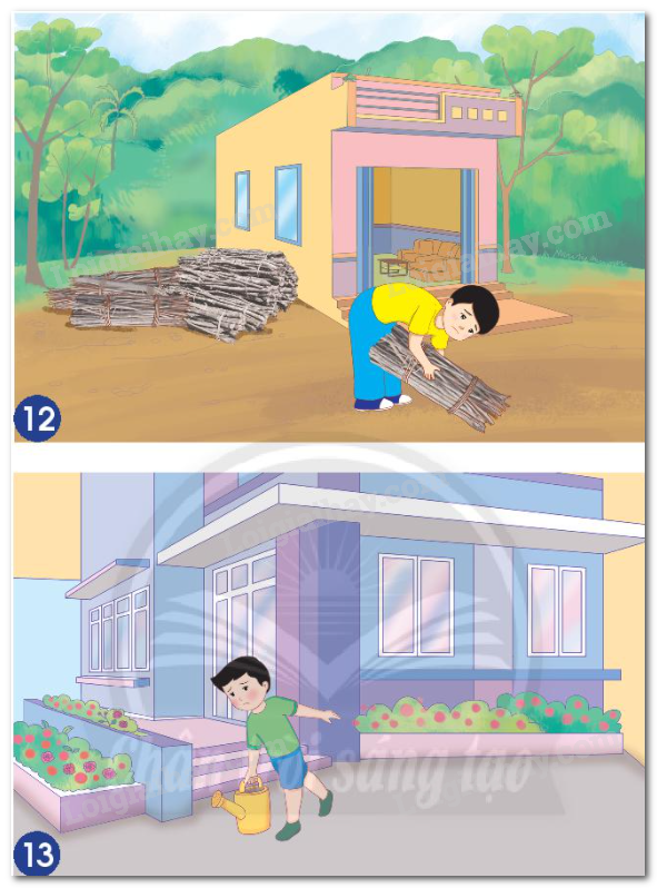 – Các bạn trong mỗi hình đều đang mang, vác vật nặng như củi, bình tưới cây.