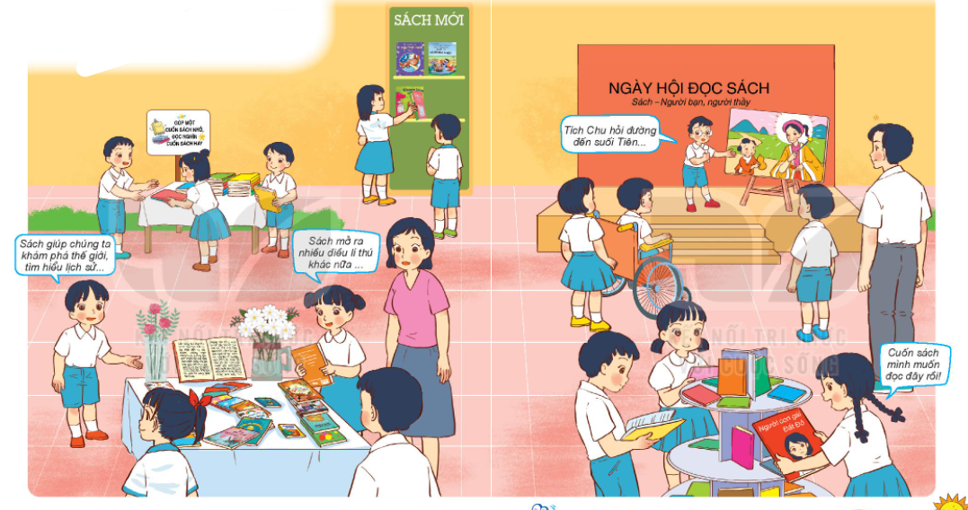 Quan sát hình trên, trả lời câu hỏi và yêu cầu sau. Ngày hội đọc sách của trường Minh và Hoa đã diễn ra những hoạt động nào. Nêu ý nghĩa của Ngày hội đọc sách.