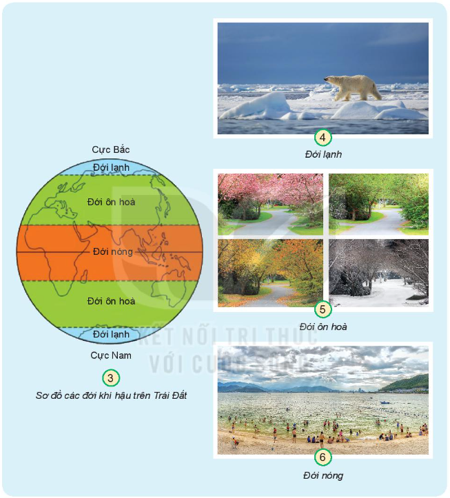 3. Quan sát từ hình 3 đến hình 6, chỉ và nói tên các đới khí hậu. Từng đới khí hậu có đặc điểm gì?