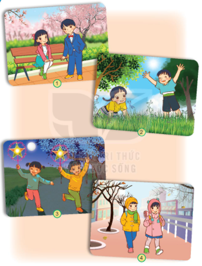 – Hình 3 (mùa thu): mặc quần áo dài tay để ấm hơn vì thời tiết mát mẻ, hơi se lạnh.