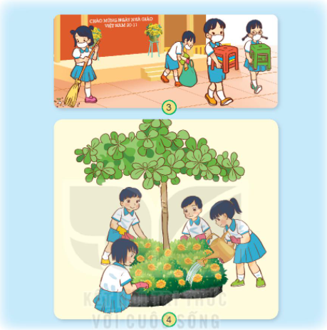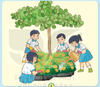 + Các bạn đang cùng nhau tưới nước và chăm sóc bồn hoa.