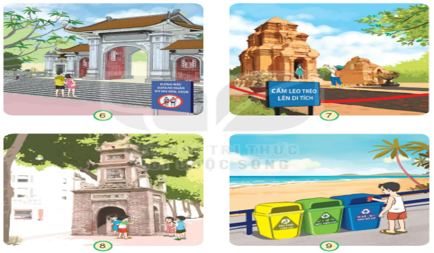 Quan sát các hình sau đây và trả lời câu hỏi: Những người trong hình đang làm gì. Những việc nào nên làm, không nên làm để thể hiện sự tôn trọng và giữ gìn vệ sinh khi đi tham quan. Chia sẻ những việc em đã làm để thể hiện sự tôn trọng, giữ vệ sinh khi đi tham quan.