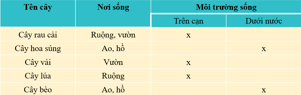 1. Quan sát, nói tên và nơi sống của cây trong mỗi hình dưới đây. 2. Các cây đó sống ở môi trường trên cạn hay dưới nước? 3. Phân loại các cây em biết dựa vào nơi sống, môi trường sống và hoàn thành bảng theo mẫu.