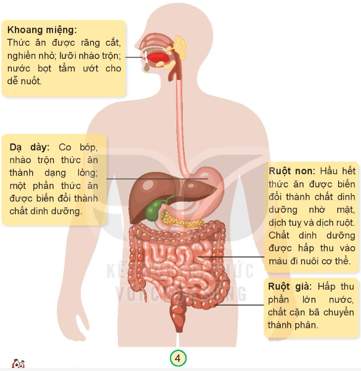 – Ruột non: Hầu hết thức ăn được biến đổi thành chất dinh dưỡng nhờ mật, dịch tụy và dịch ruột. Chất dinh dưỡng được hấp thu vào máu đi nuôi cơ thể.