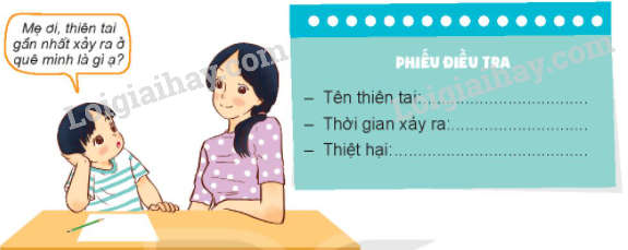 1. Hỏi người thân (ông, bà, bố hoặc mẹ,…) về thiên tai gần nhất ở địa phương và điền vào phiếu điều tra.