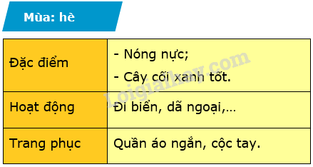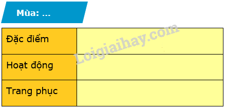 1. Em chọn 1 trong 4 mùa (xuân, hạ, thu, đông) để trình bày đặc điểm theo gợi ý trong bảng.