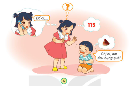 – Tình huống trong bức tranh: Hai chị em ở nhà cùng nhau, người em kêu đau bụng vì đã ăn miếng dưa hấu bị hỏng.