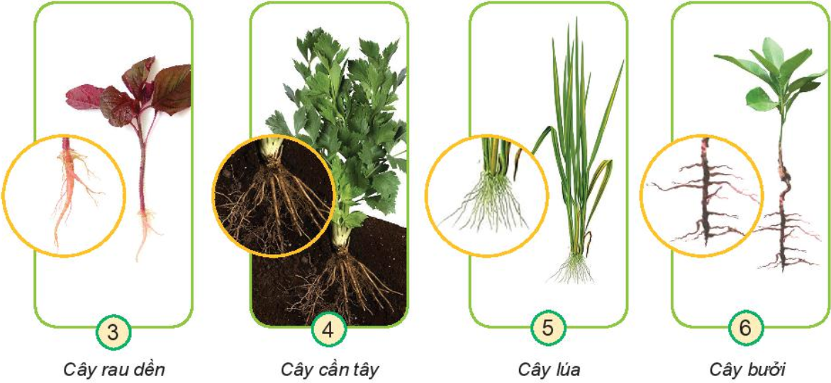 Sắp xếp các cây từ hình 3 đến hình 6 vào hai nhóm: rễ cọc, rễ chùm. Nhận xét và so sánh hình dạng, kích thước các rễ cây đó.