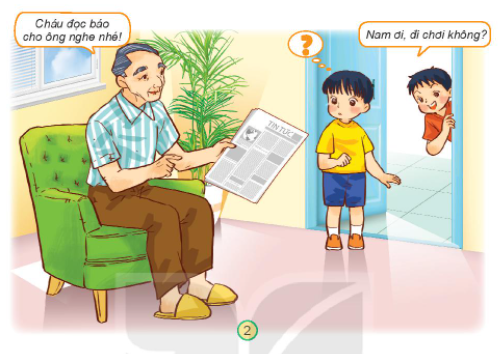 – Tranh 2: Nếu là bạn nhỏ mặc áo vàng trong tranh, em sẽ nói với bạn của mình là “Tớ xin lỗi. Hôm nay tớ không đi được rồi. Khi khác chúng mình cùng đi chơi nhé!”. Sau đó, em sẽ ở nhà đọc báo cho ông nghe.