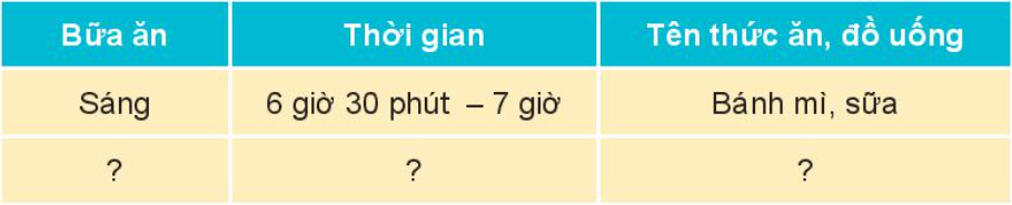 1. Chia sẻ với bạn về các bữa ăn hằng ngày của em theo gợi ý sau: