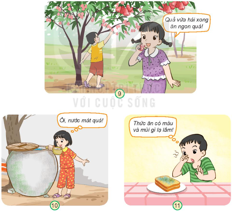 – Hình 9: Em sẽ nói với bạn rằng sau khi hái quả trên cây xuống nên rửa sạch rồi mới ăn.