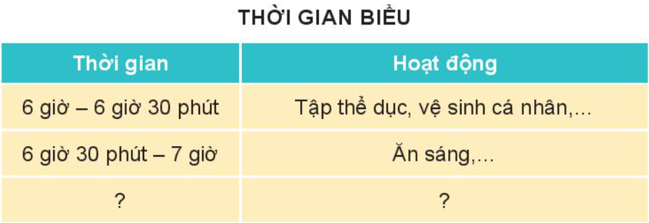 Lập thời gian biểu các hoạt động trong ngày của em theo gợi ý sau. Chia sẻ với các bạn về thời gian biểu của em.