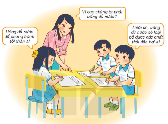 1. Nói với bạn sự cần thiết của việc uống đủ nước, không nhịn tiểu để phòng tránh sỏi thận. 2. Thảo luận để đưa ra cách thực hiện thói quen tốt giúp bảo vệ cơ quan bài tiết nước tiểu.