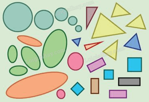 ⦁ Ta thấy trong các cặp hình vừa tìm được, có cặp hình có kích thước bằng nhau (các cặp hình tam giác màu vàng, cặp hình elip màu xanh lá, cặp hình vuông màu xanh biển, cặp hình chữ nhật màu tím) và có cặp hình có kích thước khác nhau (các cặp hình tròn màu xanh, các cặp hình tam giác màu vàng, các cặp hình elip màu xanh lá, cặp hình elip màu cam, cặp hình tròn màu hồng, cặp hình tam giác màu xanh dương, các cặp hình vuông màu xanh biển).