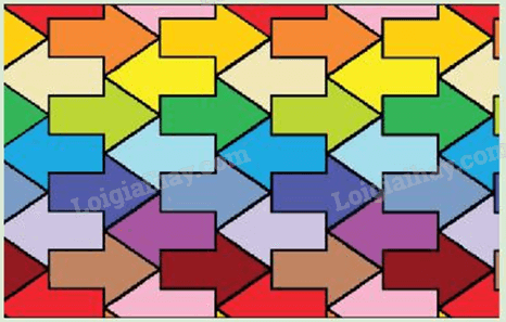 Bức tranh trang trí trong hình bên trước khi tô màu thực chất được tạo ra từ một hình mũi tên duy nhất và được dời chỗ tới các vị trí khác nhau. Hãy thảo luận để tìm hiểu về các phép biến đổi hình học nào đã tạo ra tất cả các hình mũi tên như vậy từ một hình mũi tên ban đầu.