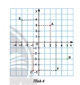 Từ điểm \(F\) ta vẽ vuông góc với \(Ox;Oy\) cắt \(Ox\) tại 3 và cắt \(Oy\) tại – 5 nên \(E\left( {3; – 5} \right)\).