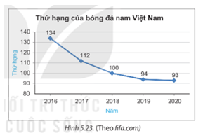 Biểu đồ Hình 5.23 cho biết thứ hạng của bóng đá nam Việt Nam trên bảng xếp hạng của Liên đoàn Bóng đá thế giới (FIFA) trong các năm từ 2016 đến 2020.