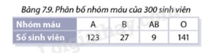Nhóm máu của \(300\) sinh viên đến trước được thống kê trong Bảng 7.9 dưới đây: