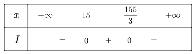 Tam thức \(I =  – 3{x^2} + 200x – 2325\) có \(\Delta  = 12100 > 0\), có hai nghiệm phân biệt \({x_1} = 15;{x_2} = \frac{{155}}{3}\) và có \(a =  – 3 < 0\)