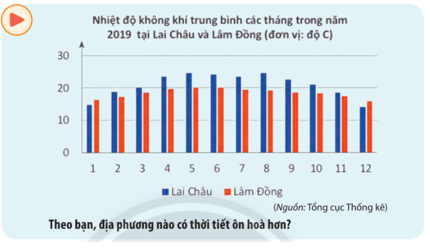 Dưới đây lfa bảng số liệu thống kê của Biểu đồ nhiệt trung bình các tháng trong 2019 của hai tình Lai Châu và Lâm Đồng (được đề cập đến ở hoạt động khởi động của bài học)