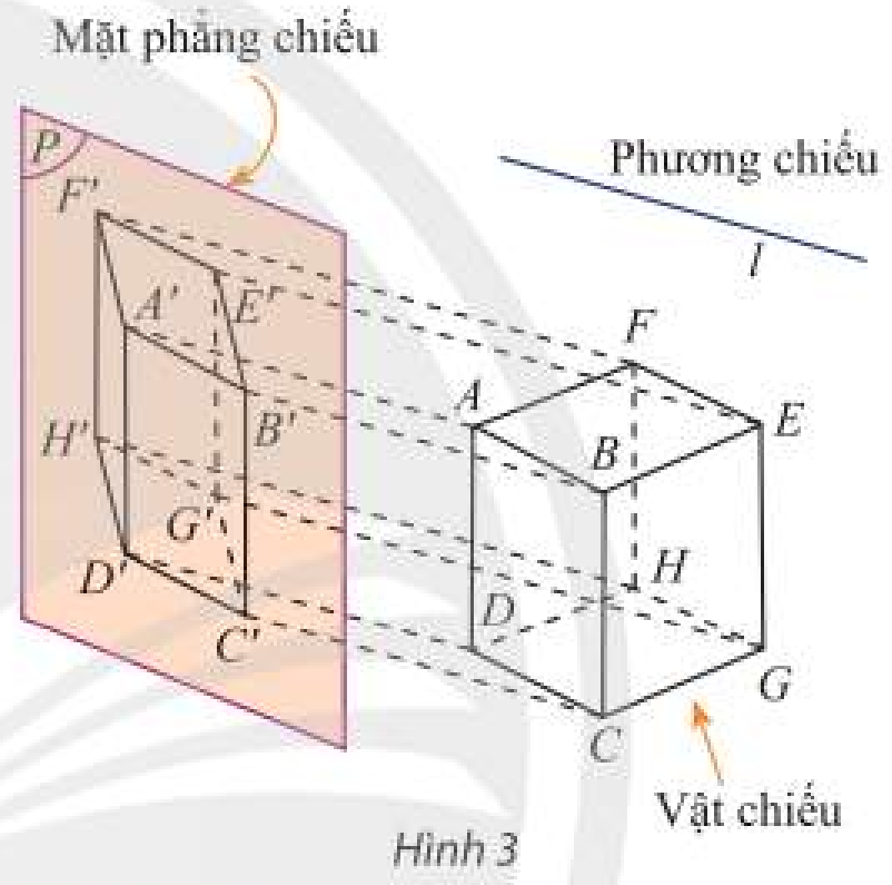 Ảnh của hình hộp \(ABEF.DCGH\) qua phép chiếu song song được mô tả trong Hình 3 là hình \(A’B’E’F’.D’C’G’H’\)