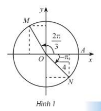 Trong Hình 1, M và N là điểm biểu diễn của các góc lượng giác \(\frac{{2\pi }}{3}\) và \(\frac{\pi }{4}\) trên