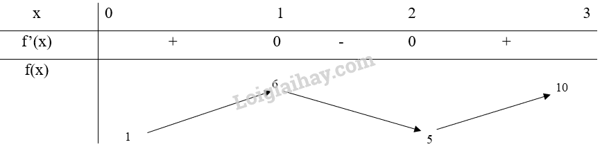 Từ bảng biến thiên, ta thấy \(\mathop {\min }\limits_{[0;3]} f(x) = f(0) = 1\) và \(\mathop {\max }\limits_{[0;3]} f(x) = f(3) = 10\)